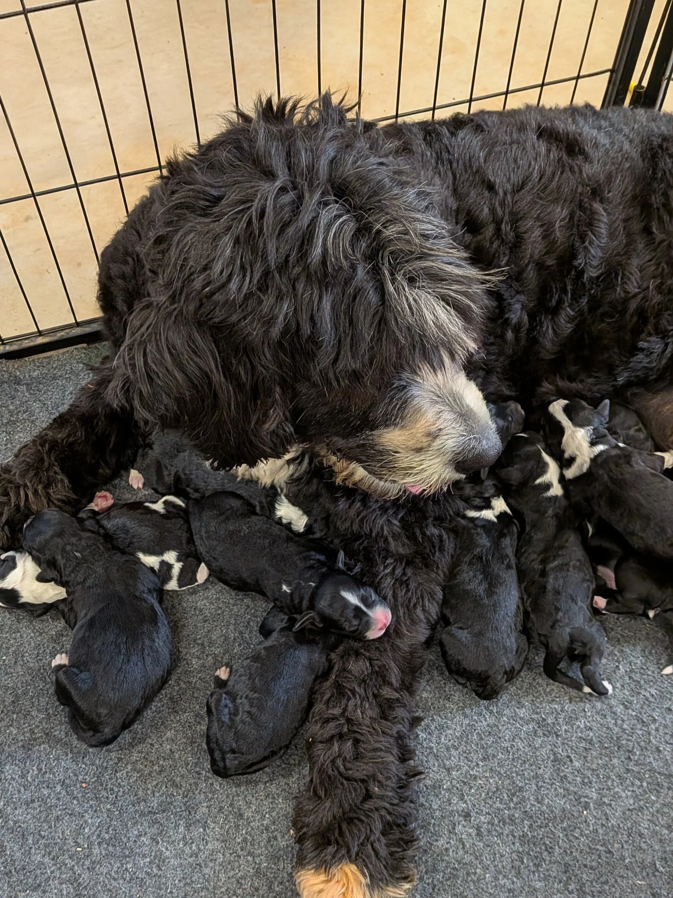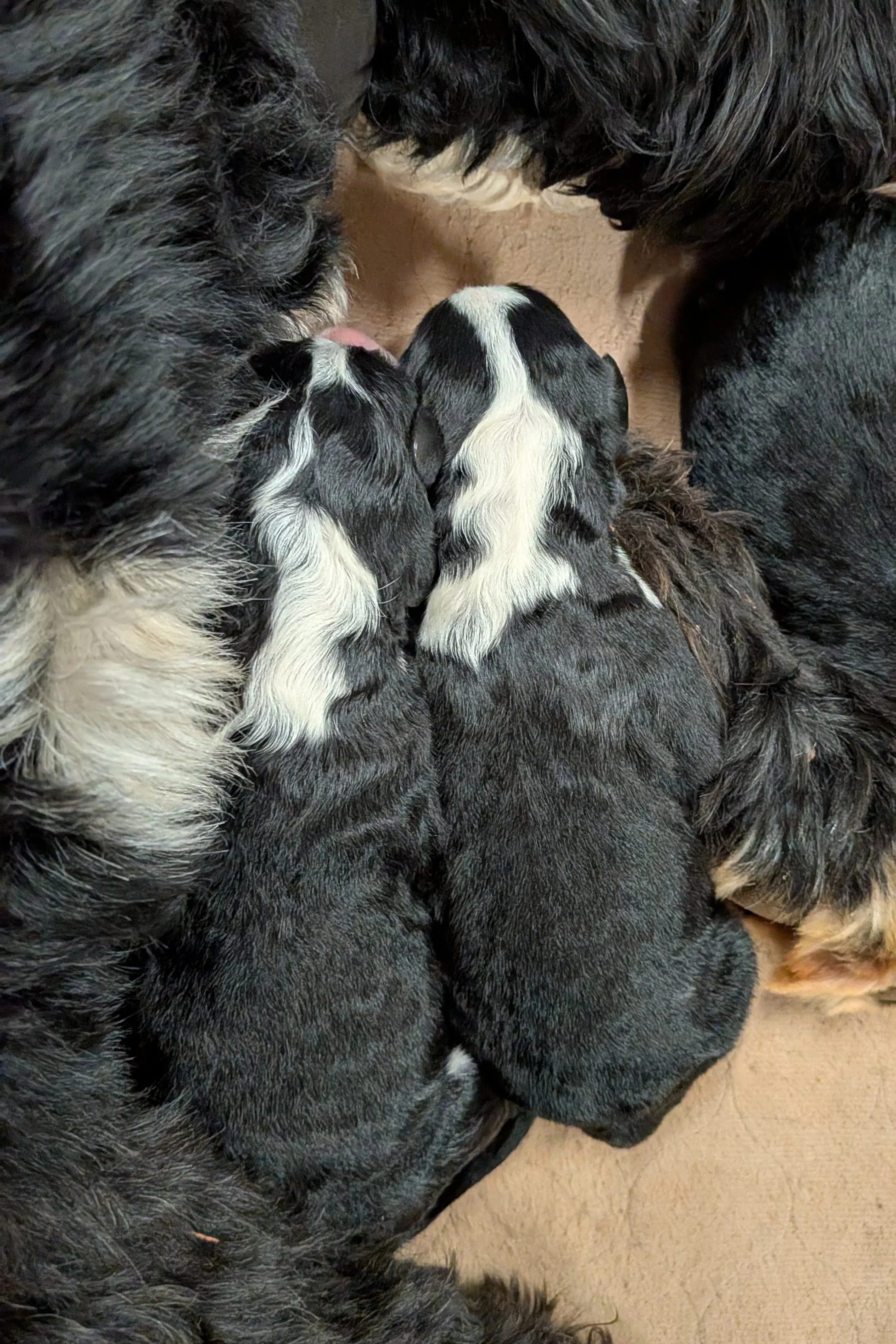 We are a small hobby breeder of Bernese Water Dogs, a new designer breed that combines the delightful qualities of the Portuguese Water Dog and the Bernese Mountain Dog. Our dogs are known for their friendly nature and are excellent companions for children, making them a wonderful addition to any family. You get the benefits of the calmer side of the BMD but yet the friendly, intelligent side of the PWD… They are hyper-allergenic and non-shedding and you have the benefits of the softness of the coat from the BMD… They have webbed feet for faster swimming and enhancing their swimming ability making them particularly adept in the water… Our puppies are 75% Portuguese Water Dog (PWD) and 25% being Bernese Mountain Dog (BMD). This is due to their mother being a new designer breed of both PWD and BMD, while their father is a purebred PWD. As a result, the puppies exhibit more characteristics and traits associated with the Portuguese Water Dog breed. They have far less medical issues and enjoy a much longer lifespan compared to the BMD. For more information about Bernese Water Dogs, click on the Learn More…