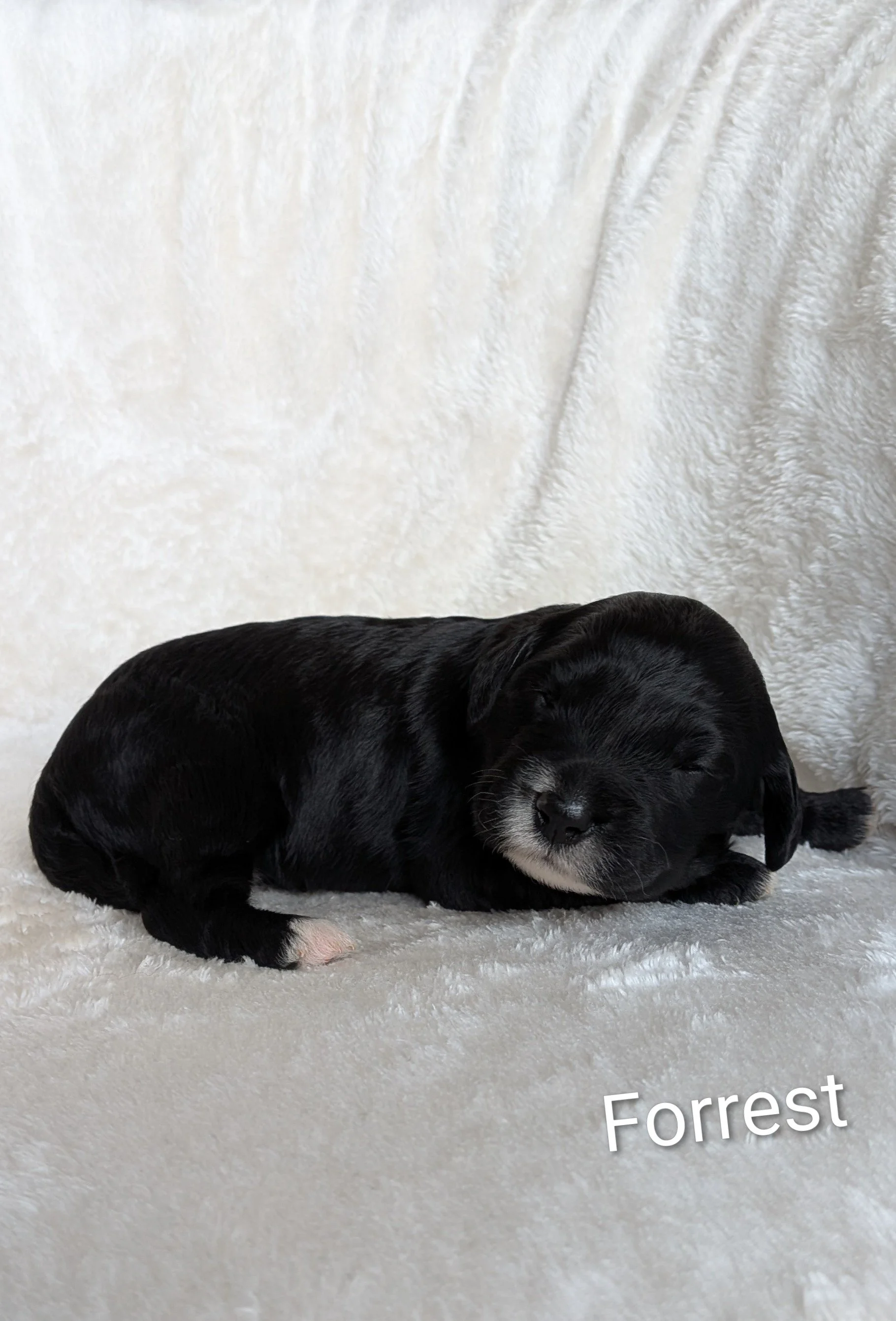 Forrest is primarily a stunning black color, with just a charming touch of white on his nose that extends down to his stomach. and a few small, delicately dipped white feet. This beautiful combination gives him a striking appearance.
