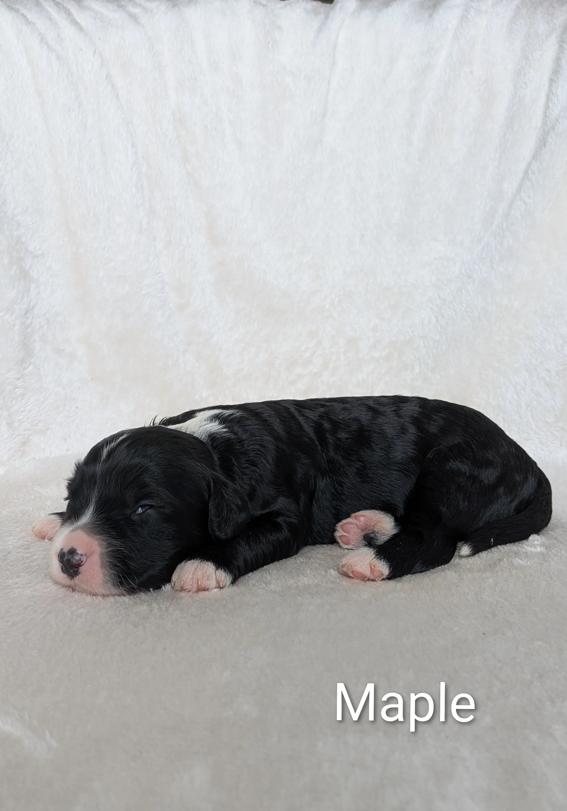 Maple has beautifully designed markings, with an elegant thin line that runs perfectly down her face into a white muzzle, complemented by a beautifully placed white patch across her neck and shoulders. and topped of by stunningly capped white paws and tail!