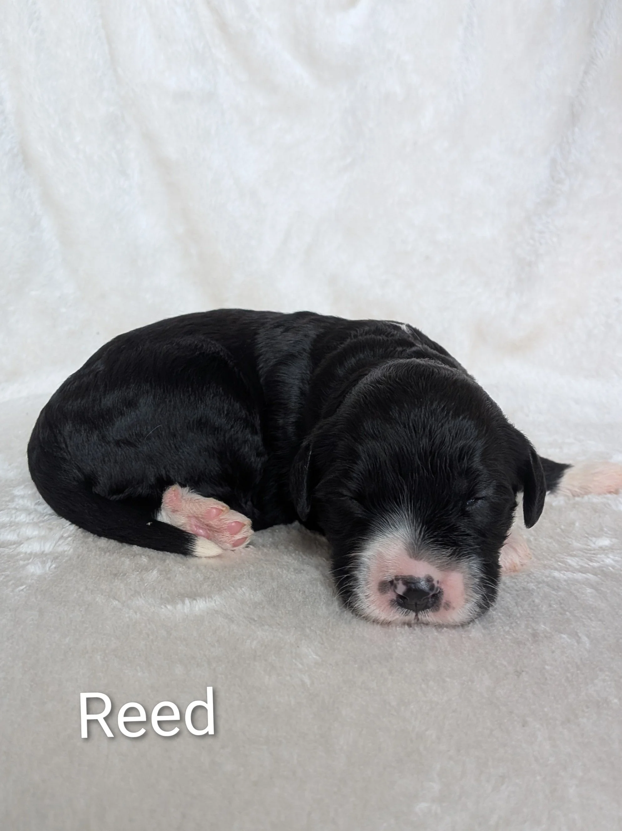 Reed is mostly black with a beautifully placed small white spot on the back of his neck along with some white on his nose and face going down to his stomach. His tail is delicately tipped in white, and he has four stunningly white-capped feet.